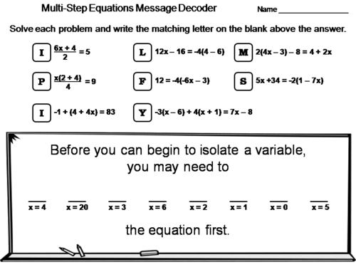 Free math worksheets multi step equations. Multi Step Equations Worksheets Teaching Resources | TpT This worksheet focuses solving multi step equations (no fractions or decimals) using various methods including the distributive property. Includes key, but is not visible in the preview. This worksheet is included in my Algebra Coloring Worksheet Bundle.Each question corresponds to a matching answer that gets colored in to form a symmetrical ... Free Equation Worksheets for One and Two-Step Problems Free Equation Worksheets for One and Two-Step Problems Solving One and Two-Step Equations - The cool thing about this freebie is that they make algebra fun. Grab these free algebra one and two-step equations maze puzzles for your students. Your students can get independent practice for the correct answer with this freebie and answer key. Two Step Equations Worksheets - TheWorksheets.CoM ... Two step equations are equations that can be solved in to steps. One step is to undo the addition or subtraction, the other is to undo the multiplication or division. EXAMPLE: 3w + 5 = 23 2x + 3 = 9 STEPS 3x + 2 = 23 STEPS -2y - 7 = 3 STEPS 4 + 2 5 r = -2 STEPS . Some two step equations can be solved more than one way! ... Multi Step Equations Worksheets | Math Worksheet Island There is two step and multiple step equations worksheets with integers and decimals. A person can also see the Multi Step Equation Worksheet image gallery that. Below you can download some free math worksheets and practice. The 7m and the -2m will combine to be a 5m and the -5 and the 2 will combine to become -3.