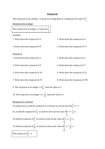Reciprocal Maths - GCSE Maths - Steps, Examples & Worksheet The reciprocal of a number is 1 1 divided by the number. The reciprocal, also called the multiplicative inverse, is found by writing the original number as a fraction and "flipping" it. When we multiply a number by its reciprocal, the answer is always 1. 1. For example, Every number has a reciprocal except 0 \ (1 \div 0 0 (1 ÷ 0 is undefined). Reciprocal Math Worksheets Pdf - Wakelet Reciprocal Math Worksheets Pdf - Wakelet. Daniel Smith @DanielSmith16. 1 item. Math Stars Worksheets - Homeschool Math It is hoped that in accepting the challenge of mathematical problem solving, students, their parents, and their teachers will be led to explore new mathematical horizons. Math Stars are in sets for Grades 1-8 and include commentaries for teachers. All Math Stars Newsletters are ready for classroom use and available for downloading as PDF files. Reciprocal Number Worksheet Teaching Resources | TPT FREE - Math Worksheets - Math Centers - Mini Worksheet - Calculator Riddles (Gr. 3-6). In this free math worksheets sample: 4 large number problems with answer key (pdf). Where numbers are words: calculate the problem, turn the answer upside down, and you'll get the joke. The mini worksheet reinforces number fluency and basic calculator use.